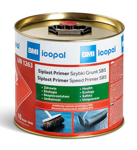 Siplast Primer Szybki Grunt SBS to preparat asfaltowy przeznaczony do gruntowania wyprodukowany w oparciu o asfalt modyfikowany SBS o niewielkiej lepkości. Posiada doskonałą wydajność, krótki czas wysychania (poniżej 2,5 godz) oraz cechuje się głęboką penetracją podłoża. Siplast Primer Szybki Grunt SBS stosowany jest do gruntowania betonu, podłoży bitumicznych i metalowych pod papy zgrzewalne i masy bitumiczne na płaszczyznach poziomych i pionowych w częściach nadziemnych i podziemnych budynków. Produkt służy do gruntowania obróbek metalowych, blach stalowych oraz ocynkowanych przed zgrzewaniem pap, do zabezpieczania metalowych elementów ogrodzeniowych, impregnacji powierzchni drewnianych. Przed użyciem preparat należy dokładnie wymieszać, nanosić za pomocą szczotki dekarskiej, pędzla lub wałka malarskiego. Możliwe stosowanie natrysku. Preparatu nie należy stosować na podłoże mokre (powyżej 9%) lub smołowe. Nie należy stosować w czasie opadów atmosferycznych. Przechowywać w oryginalnie zamkniętych opakowaniach z dala od źródeł ciepła, w wentylowanych pomieszczeniach. Wydajność preparatu na podłożu bitumicznym: ok 0,25 l/m2 (jedna cienka warstwa) oraz 0,1 l/m2 na podłożu stalowym.